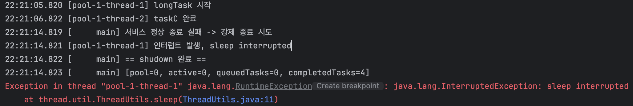 - 만약 10초가 지나도 작업이 끝나지 않으면, 그때는 shutdownNow() 를 사용해서 강제로 종료한다! 진행 중인 작업도 멈추고 강제 퇴근시킨다.