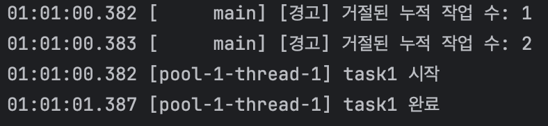 예외정책을 구현해보려면 위의 주석부분을 채우면된다. RejectedExecutionException 예외를 잡아서 작업을 포기하거나, 사용자에게 알리거나, 다시 시도하면 된다.