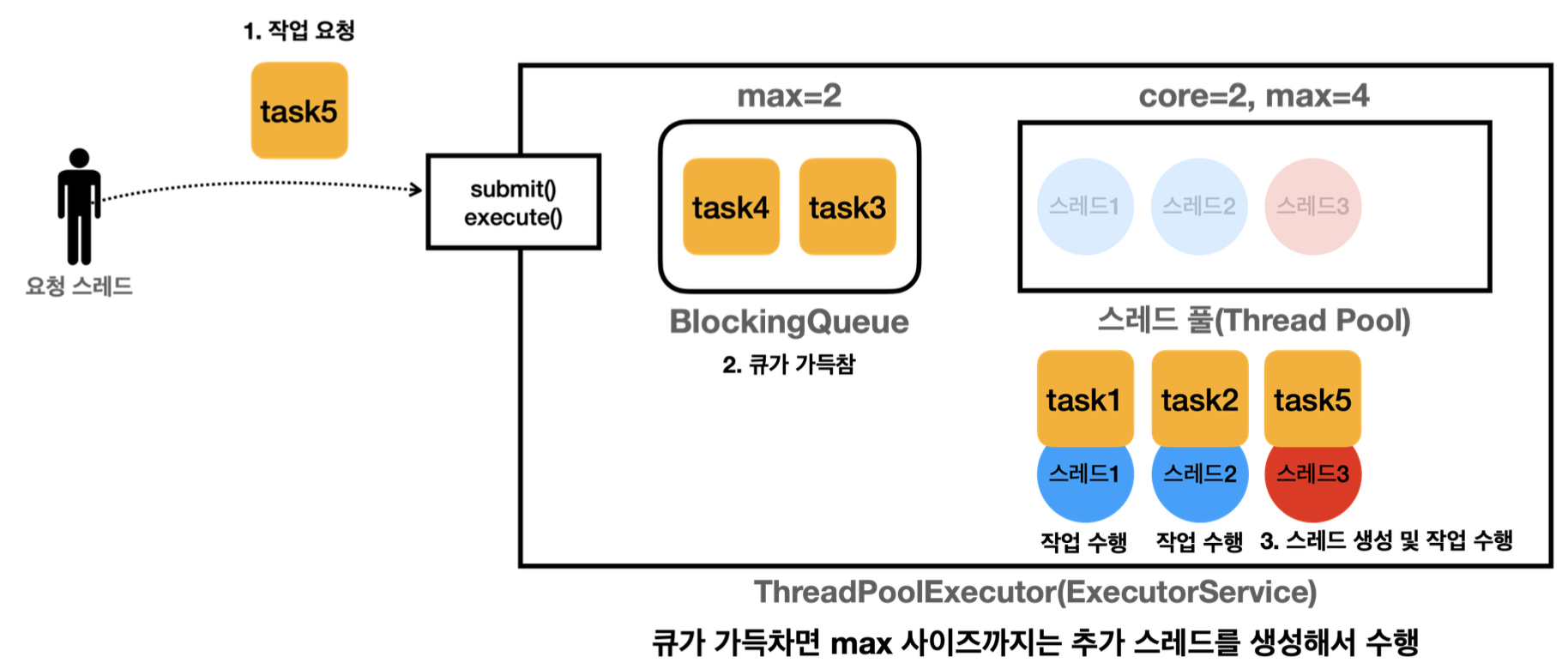 - 빌: "하지만 만약 주문이 너무 많으면 최대 스레드 수(maximumPoolSize)까지 늘릴 수 있어. 예를 들어, 4명까지 고용할 수 있도록 하자. 최대 스레드 수는 비상 인력처럼 필요한 경우에만 추가로 고용되는 거야."