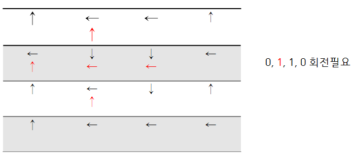 이 문제의 핵심은 맨 윗줄만 완전탐색을 하고 나머지는 앞의 줄에 종속적이란것이다. O(4**8)