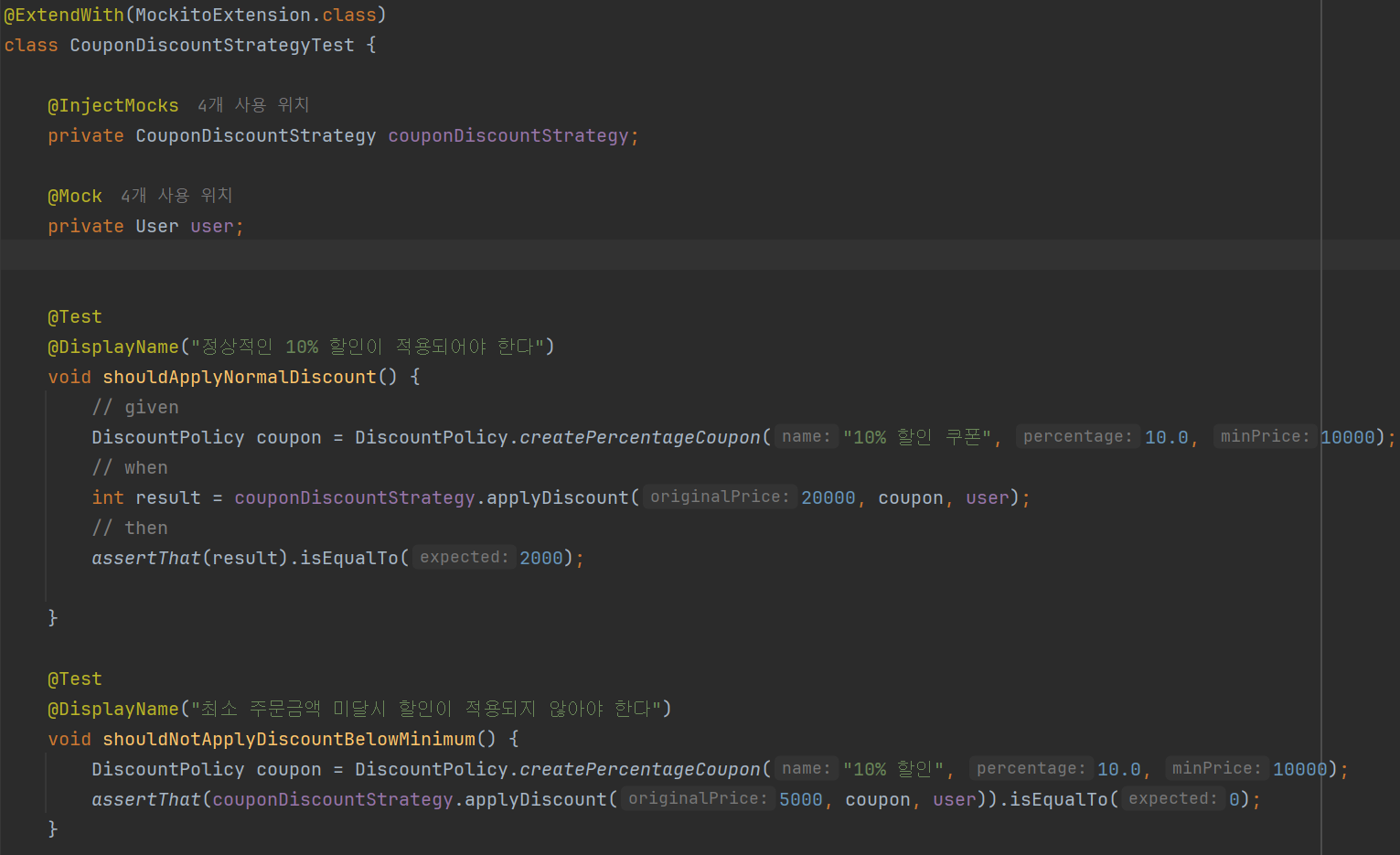 할인 정책 로직은 단순하지만 비즈니스 예외 조건이 많습니다. 저는 다음 테스트를 먼저 만들었습니다: