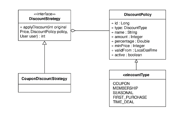 - DiscountStrategy 인터페이스는 다양한 할인 전략(Coupon, Membership 등)을 추상화합니다.