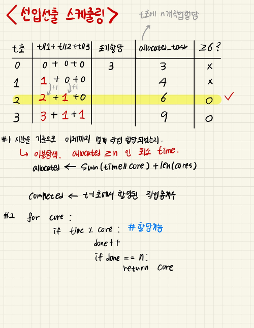 - 그렇게 최적의 시간을 찾은 뒤, 그 시간에 어떤 코어에서 마지막 작업(n번째)이 처리되는지 순차적으로 확인