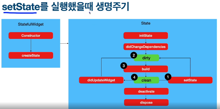 - setState는 StatefulWidget을 생성하면 특별하게 실행할 수 있는 함수이다.