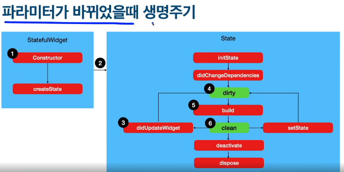 - 파라미터(ex_ 빨->파)가 바뀌어도 기존 위젯을 삭제되고 새로 위젯이 constructor에 생성되지만, 이 새롭게 생성된 위젯은 기존에 사용중이던 State에 재활용하게 된다.