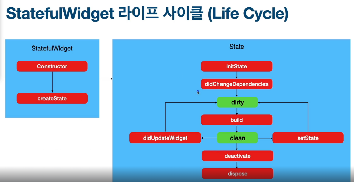 - 우선 클래스의 생성자가 실행된다. 그 후 createState라는 함수가 실행된다. (stateless 위젯은 build함수 실행)