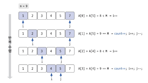 A[i] + A[j] == M : i++; j--; count++; // 양쪽 포인터를 모두 이동시키고 count를 증가