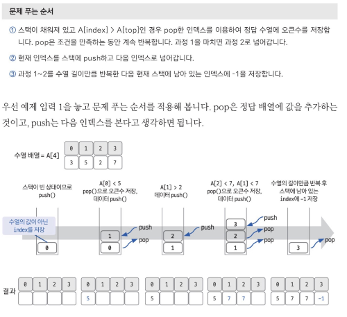- 스택에 새로 들어오는 수가 top에 존재하는 수보다 크면 그 수는 오큰수가 된다.