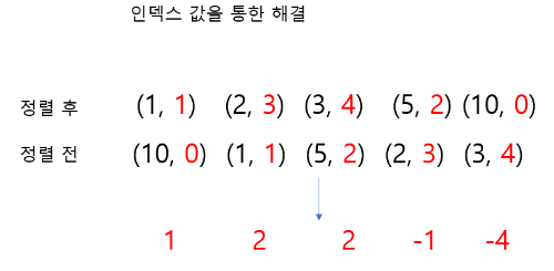 - 데이터 정렬 전 index와 정렬 후 index를 비교해 왼쪽으로 가장 많이 이동한 값(최댓값) 을 찾는다.